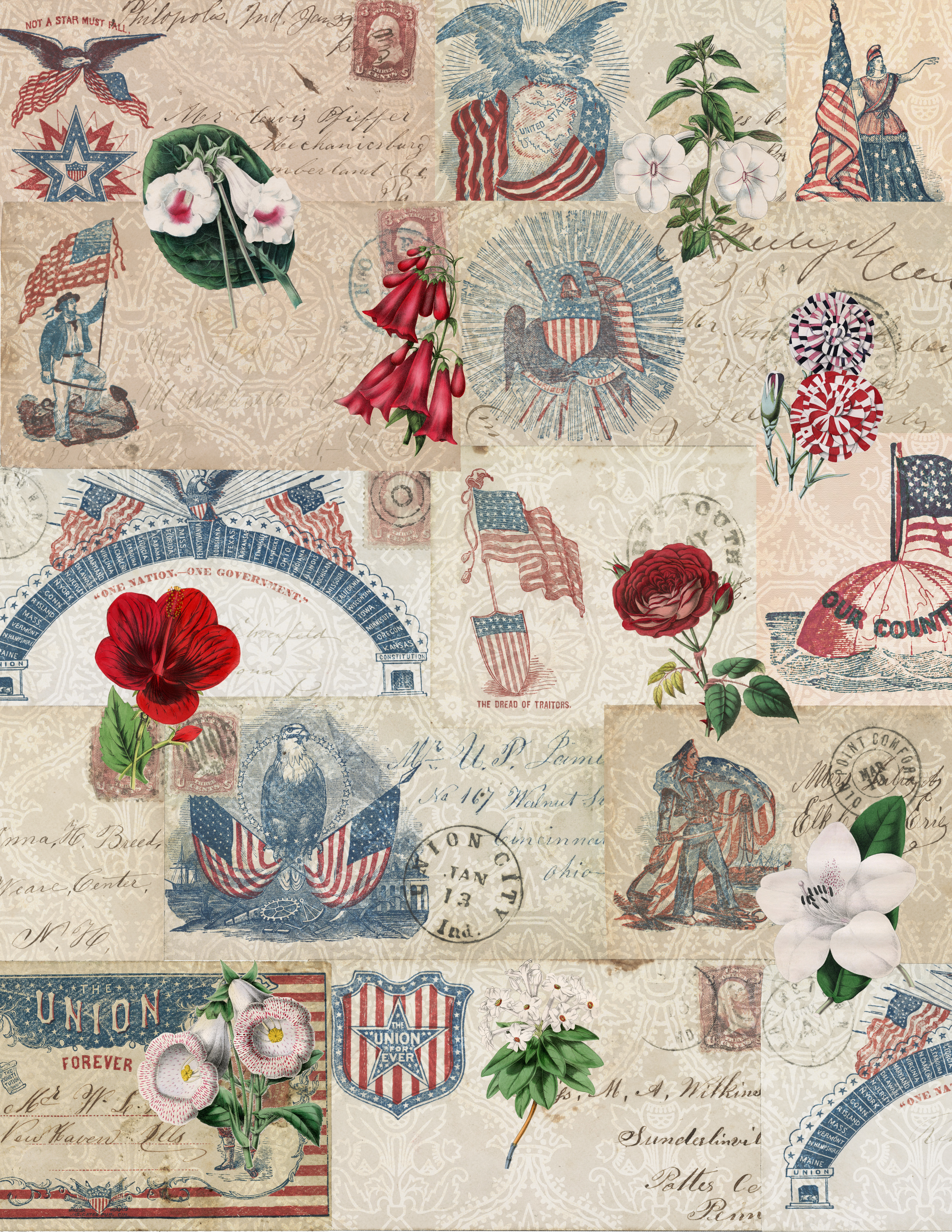 So in honor of those men and women – I put together this collage page that has post cards from the civil war era and beautiful illustrations of our flag, the american eagle and Lady Columbia. I hope you can use it for making some great cards, or decorating ephemera in your journals.